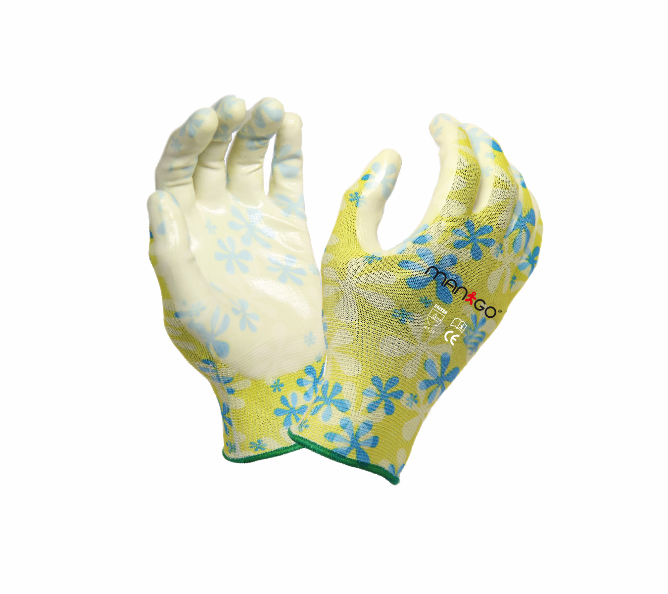 Нейлоновые перчатки с узором (под заказ) и прозрачным нитриловым покрытием на ладони. Плотность вязки 13