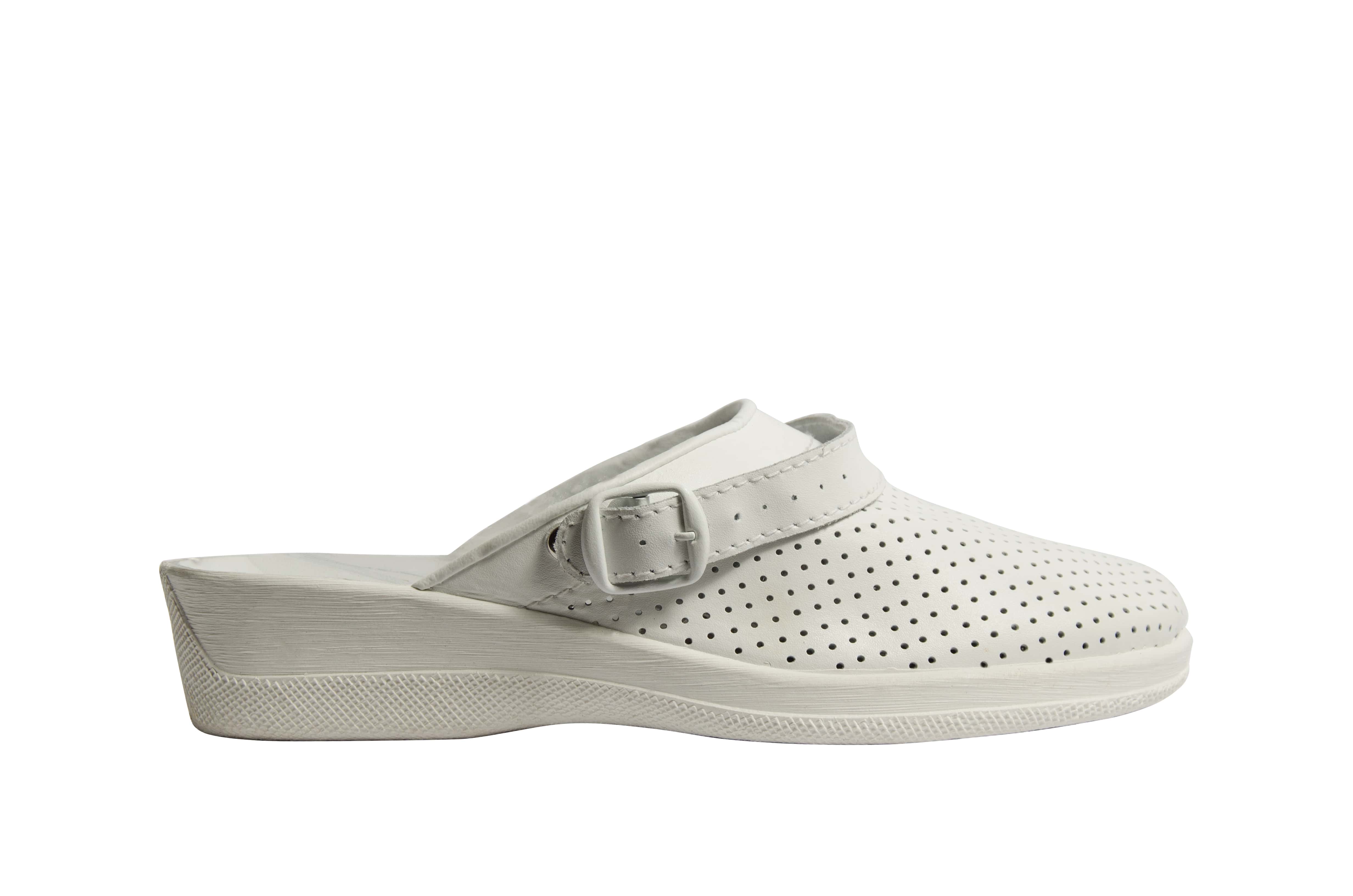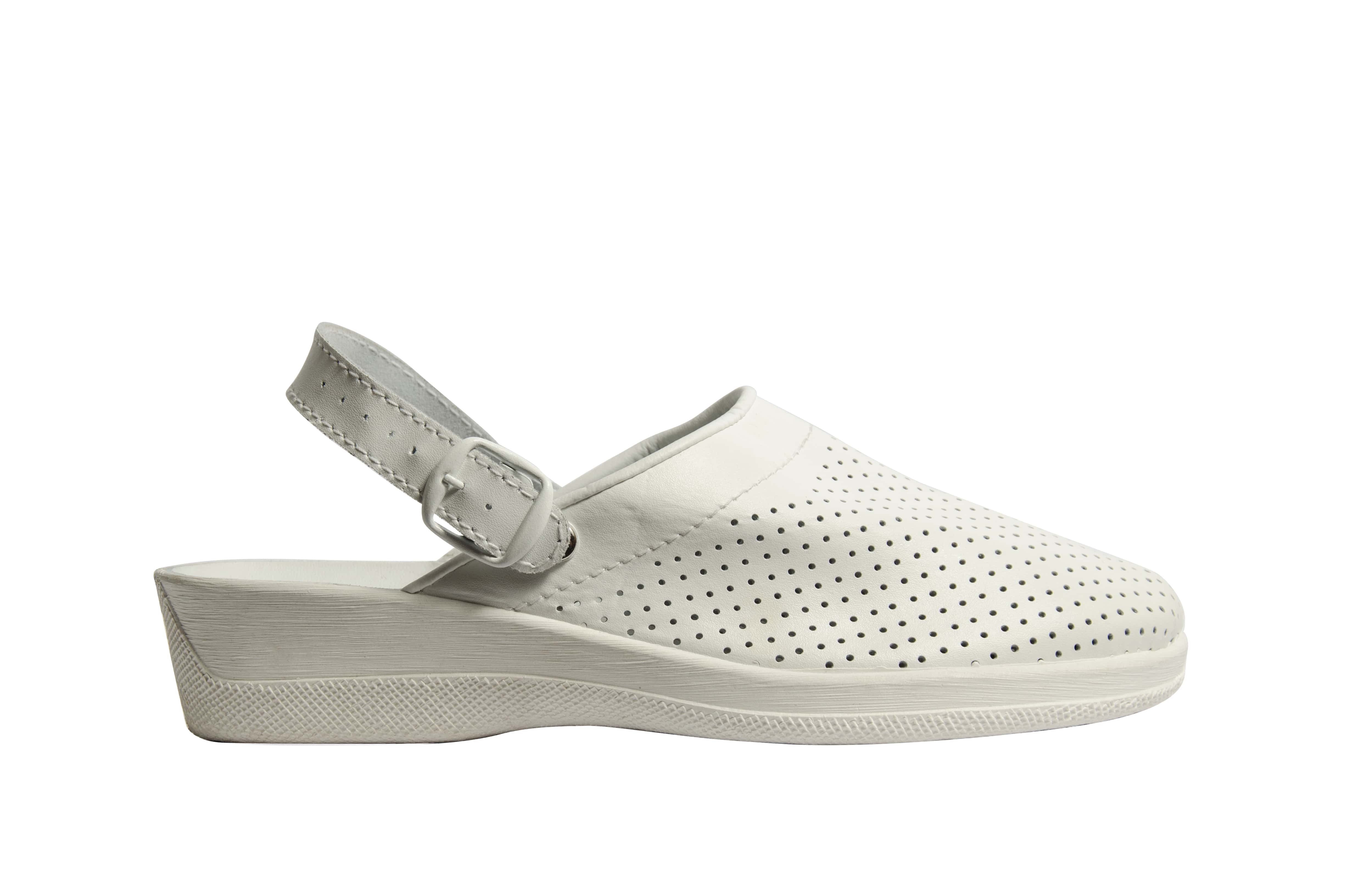 Сабо изготовлены из натуральной перфорированной кожи, что обеспечивает комфорт при любых температурных условиях. В модели есть ПВХ подошва, кожаная стелька и перекидной ремешок-фиксатор на пятку. Подошва обеспечивает отличный контакт с твердыми поверхностями, достаточно гибкая и прочная. Дизайн модели и технология ее производства обеспечивают хороший воздухообмен, что не могут не оценить люди, которые проводят в них все свое рабочее время. Благодаря достаточно высокому качеству сырья, из которого изготавливают сабо, к ее плюсам можно отнести и износостойкость, а отсюда и экономичность. Обувь разработана для медработников, парикмахеров, работников пищевой промышленности